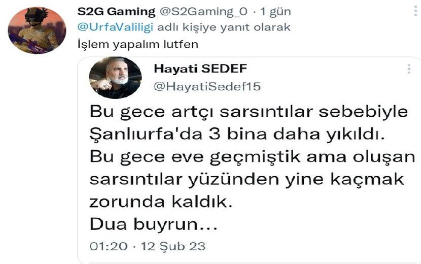 Bilindiği üzere Şanlıurfa’da 3 bina daha yıkıldı” şeklinde paylaşımda bulunan Hayati Sedef, 12 Şubat’ta gözaltına alınıp, ardından çıkarıldığı mahkemece tutuklanmıştı.
