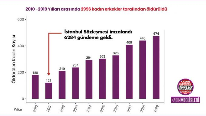 Aşağıdaki görselde İstanbul Sözleşmesi ve bu sözleşmeye binaen çıkartılan 6284 S.Y. sonrasında ülkemizde yaşanan kadın cinayetleri ifade edilmektedir. Görselde, İstanbul Sözleşmesi'nin imzalanmasının ardından kadın cinayetlerindeki artış dikkat çekmektedir.