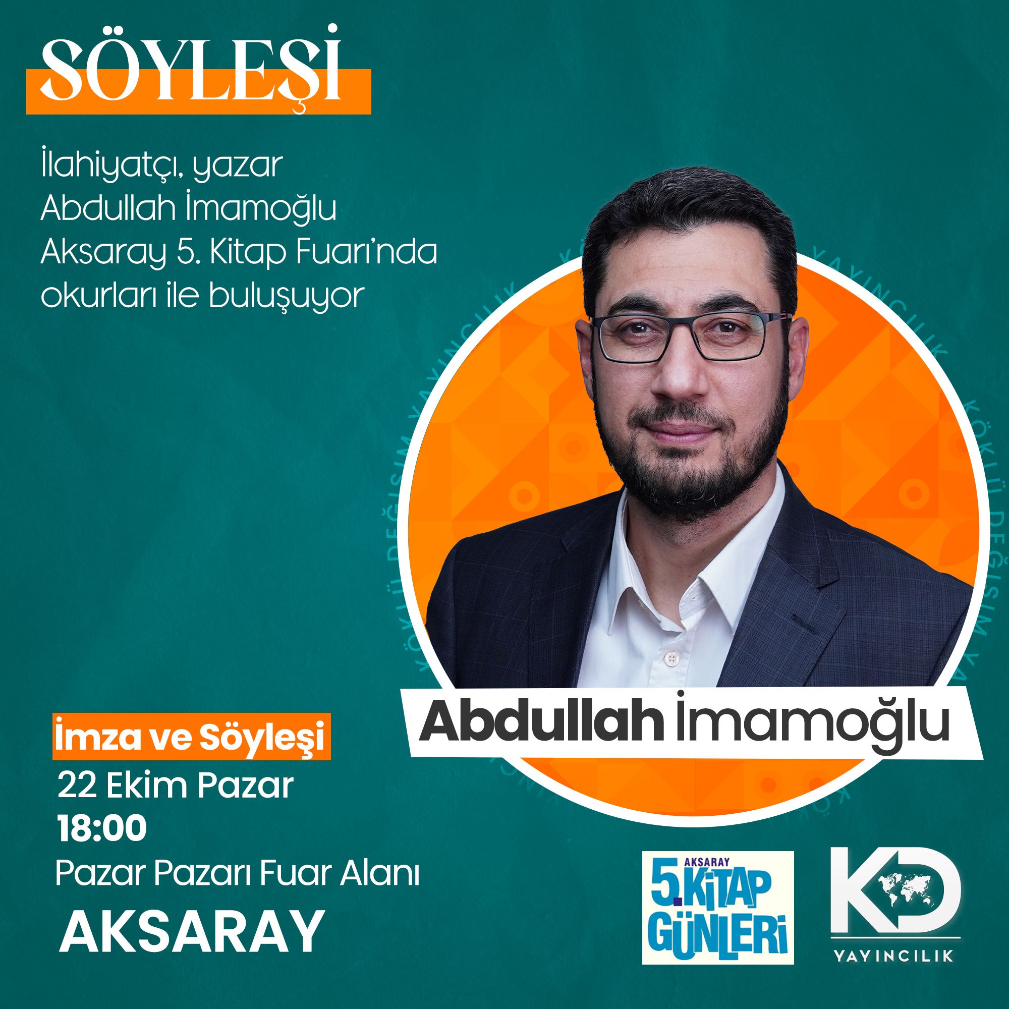 Köklü Değişim Aksaray Temsilciliği, 5. Kitap Günleri'nde, 22 Ekim Pazar günü saat 18:00'de fuar alanında Köklü Değişim yazarlarından ilahiyatçı Abdullah İmamoğlu’nun katılacağı bir söyleşi gerçekleştirecek.