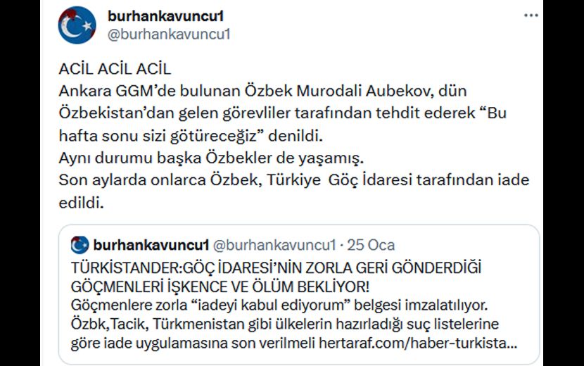Türkistanlılar Derneği Başkanı Burhan Kavuncu, konuyla ilgili “ACİL” başlığıyla duyurduğu sosyal medya paylaşımında, “Ankara GGM’de bulunan Özbek Murodali Aubekov, dün Özbekistan’dan gelen görevliler tarafından tehdit edilerek ‘bu hafta sizi götüreceğiz’ denildi.” ifadelerini dile getirdi.