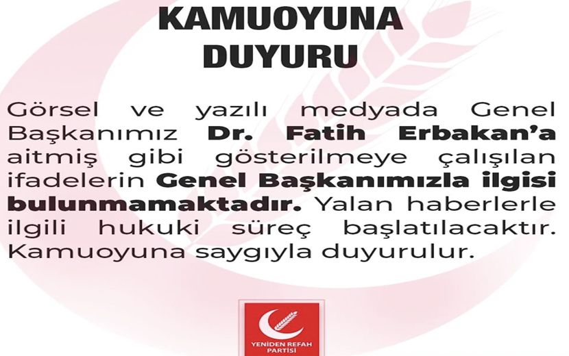 “Görsel ve yazılı medyada Genel Başkanımız Dr. Fatih Erbakan’a aitmiş gibi gösterilmeye çalışılan ifadelerin Genel Başkanımızla ilgisi bulunmamaktadır. Yalan haberlerle ilgili hukuki süreç başlatılacaktır. Kamuoyuna saygıyla duyurulur.”